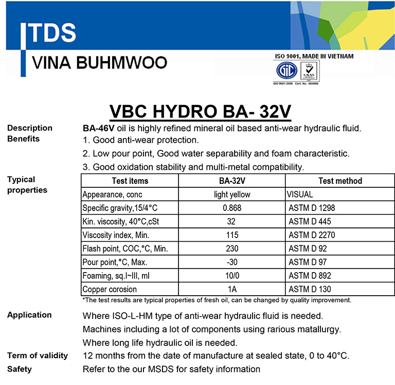 VBC HYDRO BA-32V là loại dầu thủy lực được pha chế từ dầu gốc khoáng chất lượng cao và các phụ gia chống mài mòn nên có khả năng chống gỉ và kháng nước cực tốt, tương thích với nhiều kim loại, là lựa chọn tin cậy cho các ứng dụng trong ngành cơ khí, tự động hóa và sản xuất nhẹ.