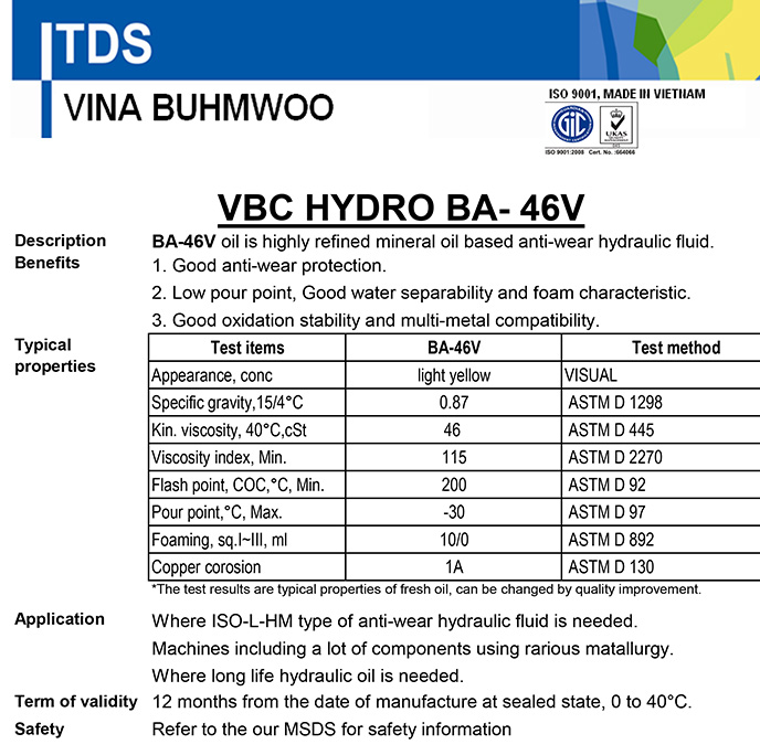 3. Thông số kỹ thuật TDS dầu thủy lực VBC HYDRO BA-46V