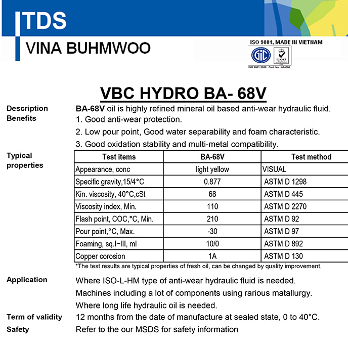 Dầu thủy lực Buhmwoo VBC HYDRO BA-68V là loại dầu thủy lực 68 cao cấp được sản xuất bởi Buhmwoo – Thương hiệu dầu công nghiệp Hàn Quốc nổi tiếng hàng đầu thế giới.