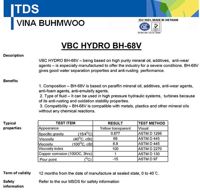3. Thông số kỹ thuật TDS dầu thủy lực Buhmwoo VBC HYDRO BH-68V